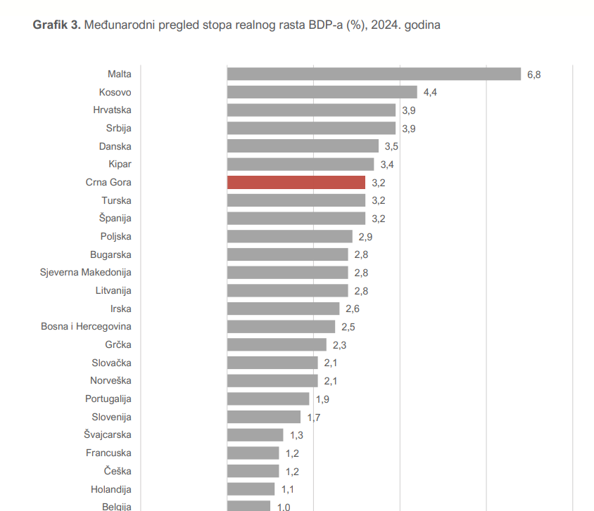 Sa rastom BDP-a od 3,2 procenta u prošloj godini, Crna Gora je zauzela sedmu poziciju u Evropi. Prva je Malta sa rastom od 6,2 odsto, slijedi Kosovo čija ekonomija je ojačala prošle godine 4,4 odsto. Ispred Crne Gore su i Hrvatska i Srbija (po 3,9 odsto), kao i Danska (3,5 odsto) i Kipar (3,4 odsto).