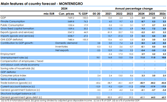 Prognoza rasta za ovu godinu je slabija u odnosu na procjene rasta iz novembra prošle godine, kada je EK navale da će crnogorski bruto-domaći proizvod (BDP) ove godine porasti 4,2 odsto. Za narednu godinu je prognoza nešto bolja, pa se sada očekuje rast od 3,2 odsto u odnosu na jesenjih tri odsto.