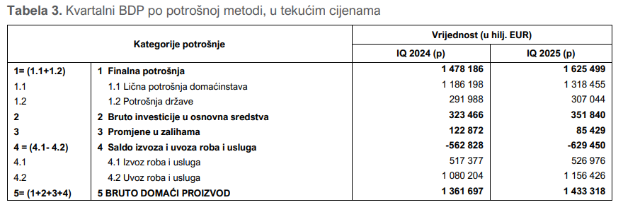 Kad je u pitanju struktura BDP-a, finalna potrošnja (lična potrošnja domaćinstava i države) ima najveće učešće, a ona je u prvom kvartalu iznosila oko 1,6 milijardi eura (lična potrošnja 1,3 milijarde, potrošnja države 307 miliona). Saldo uvoza i izvoza bio je negativan (-629,4 miliona eura). Bruto investicije u osnovna sredstva iznosile su 351,8 miliona eura, a promjene u zalihama 85,4 miliona.