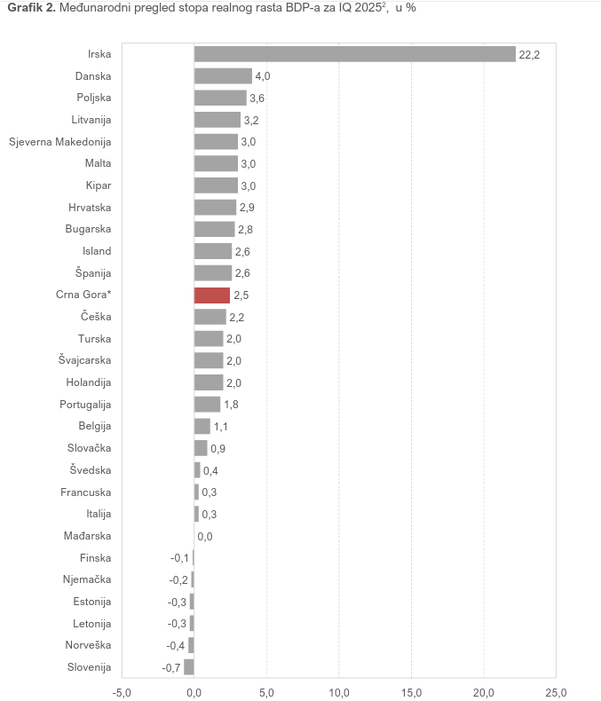 Manji rast BDP-a od Crne Gore u prvom kvartalu imale su Češka (2,2 odsto), Turska, Švajcarska i Holandija po dva odsto, Portugal 1,8 odsto, Belgija 1,1, Slovačka 0,9, Švedska 0,4, Francuska i Italija po 0,3, a Mađarska nula odsto.
