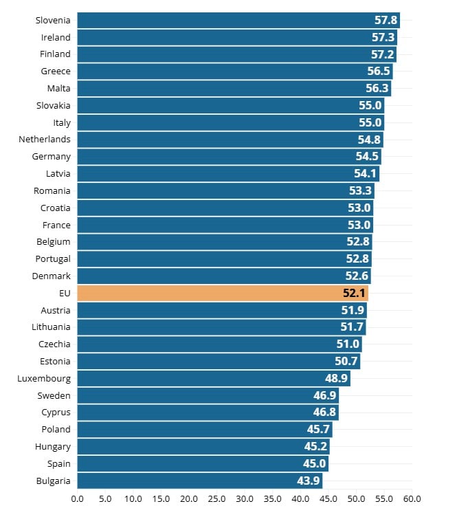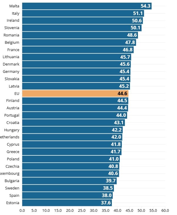 Udio poreza je ispod 40% u Estoniji (37,6%), Španiji (38%), Švedskoj (38,5%) i Bugarskoj (39,7%).
