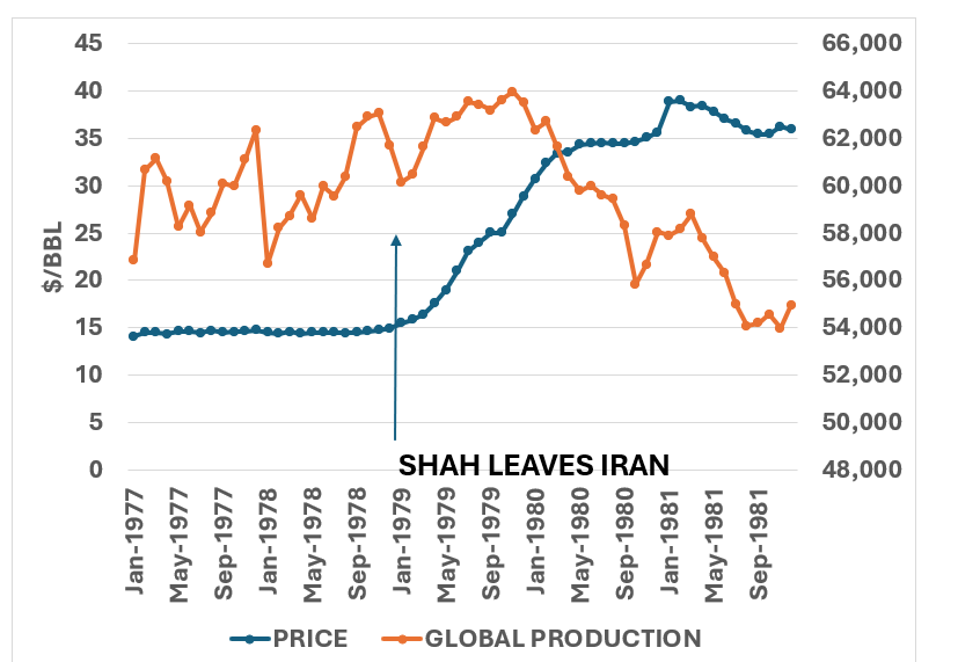Tokom Iranske naftne krize, globalne zalihe su rasle i do tri miliona barela dnevno. Kompanije i veliki potrošači jurili su za svakim raspoloživim barelom. Spot tržište je praktično nestalo, a cijene su se utrostručile. Ne kada je proizvodnja u Iranu prekinuta, već zbog panike. Kao što pokazuje grafikon ispod, šah je napustio Iran u januaru 1979, a globalna proizvodnja nafte se normalizovala do aprila. Cijene su tada bile oko 18 dolara po barelu – 50% više u odnosu na cijene prije Revolucije. Ali nastavile su da rastu i udvostručile su se do sredine 1980, gotovo godinu i po nakon Revolucije i dugo nakon što je proizvodnja obnovljena.