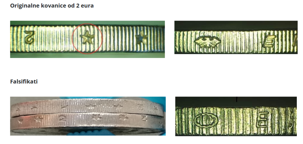 „Originalne kovanice apoena od 2 eura imaju preciznu izradu oboda, numeričkih i alfabetnih karaktera, što nije slučaj sa falsifikatima“, navodi se na sajtu CBCG.