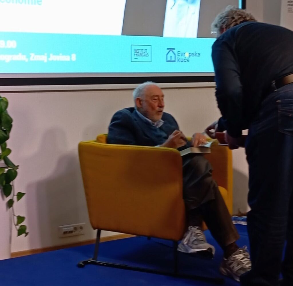 Na sinoćnu diskusiju Stiglica je pozvao Francuski institut u Srbiji. Razgovor je vodio Amos Rajhman (Amos Reichman), direktor Instituta. On je upitao i za mjesto susreta – Beograd. Čuvenom profesoru ovo je bio podsjetnik na temu tranzicije – kako iz komunizma preći na tržišnu ekonomiju i demokratsko društvo. Zanimala ga je tema koje su ekonomije kroz nju najbolje prošle.