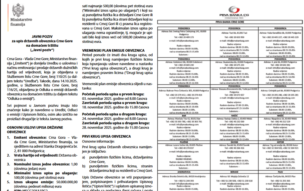 “Ukoliko interesovanje za državnim obveznicama u prvom krugu upisa obveznica bude veće od maksimalnog iznosa državnih obveznica za upis, emitent neće raspisivati drugi krug upisa obveznica”, piše u javnom pozivu.