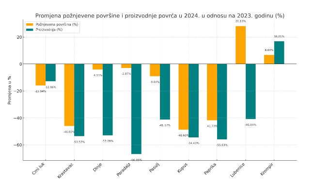 Najveći pad proizvodnje zabilježen je kod paradajza, sa smanjenjem od gotovo 67%. Slična situacija je i kod paprike, gdje je proizvodnja pala 56 procenata. Smanjena je i proizvodnja kupusa 54 %, a propolovljena je i proizvodnja krastavca (-53,57%). Ništa nije bolja situacija nije ni kod dinje, čija je proizvodnja takođe prepolovljena 2024. godine u poređenju sa 2023. dok je proizvodnja pasulja smanjena 41 %, a crnog luka oko 13 procenata.