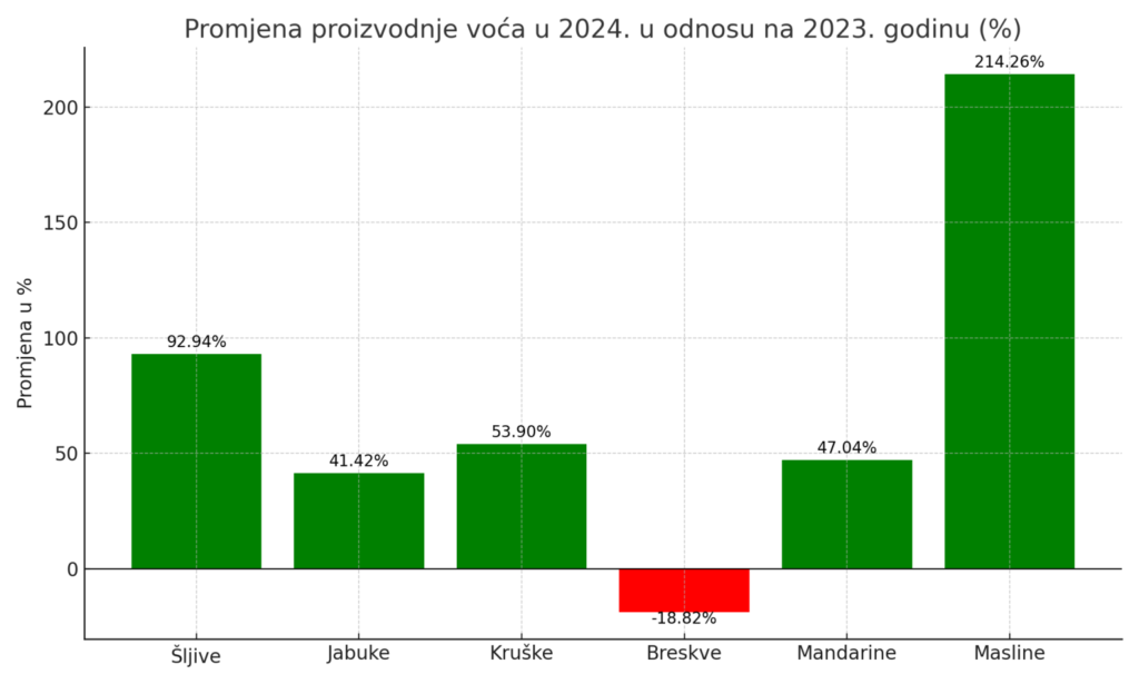 U 2024. godini, proizvodnja voća u odnosu na prethodnu godinu pokazuje značajan rast kod većine voćnih kultura, dok je zabilježen pad kod breskvi. Najveći skok zabilježen je u proizvodnji maslina, koja je porasla za čak 214,26%, što ukazuje na izuzetne rezultate u ovoj grani proizvodnje, navodi Bankar.