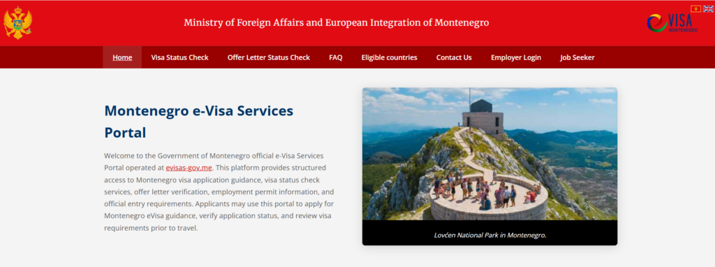 Na desnoj strani sajta nalazi se logo “VISA Montenegro”, a ispod je horizontalni meni sa više opcija, među kojima su: Home, Visa Status Check, Offer Letter Status Check, FAQ, Eligible countries, Contact Us, Employer Login i Job Seeker. Takva struktura sajta ostavlja utisak servisa za provjeru viza, radnih dozvola i prijava.
