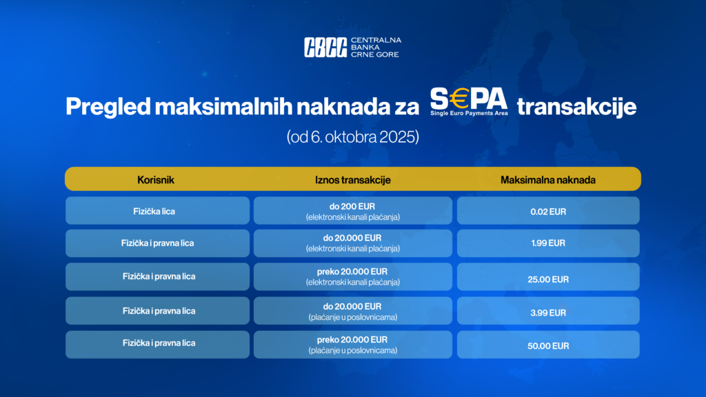 Iz CBCG su saopštili da od 6. oktobra 2025, za izvršenje SEPA kreditnih transfera, banke ne mogu građanima i privredi naplatiti naknadu veću od: