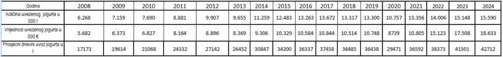 U posljednjih pet godina, uvoz jogurta povećan je 45%, dok je domaća proizvodnja smanjena za 8,3%. U odnosu na 2023. godinu, uvoz je porastao za dodatna 3%, dok je domaća proizvodnja blago opala.