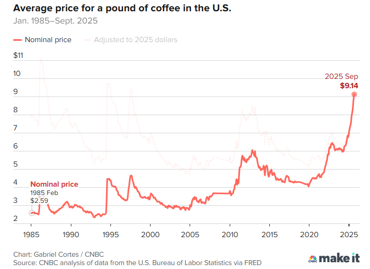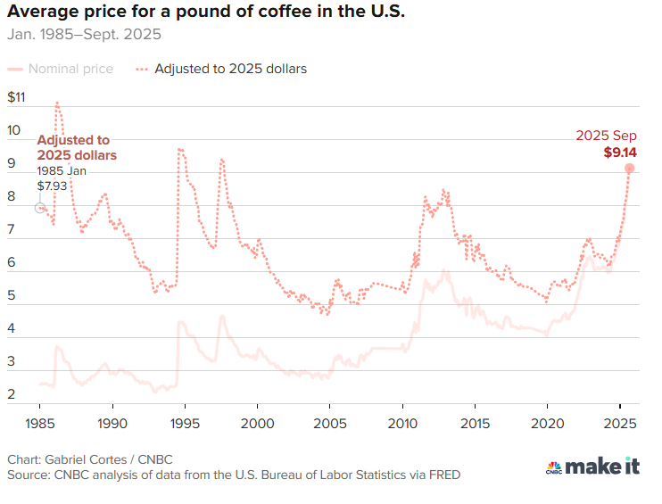 Potom su skočile cijene fjučersa na kafu, sa oko 2 dolara po funti u maju 2024. na vrhunac od 4 dolara u aprilu 2025, jedan od najstrmijih skokova koje je tržište vidjelo u decenijama, prema podacima Intercontinental Exchangea. Pošto fjučersi služe kao reper po kojem uvoznici i pržionice plaćaju sirova zrna, nagli skokovi često dovode do viših troškova, koji se kasnije preliju i na maloprodajne cijene.