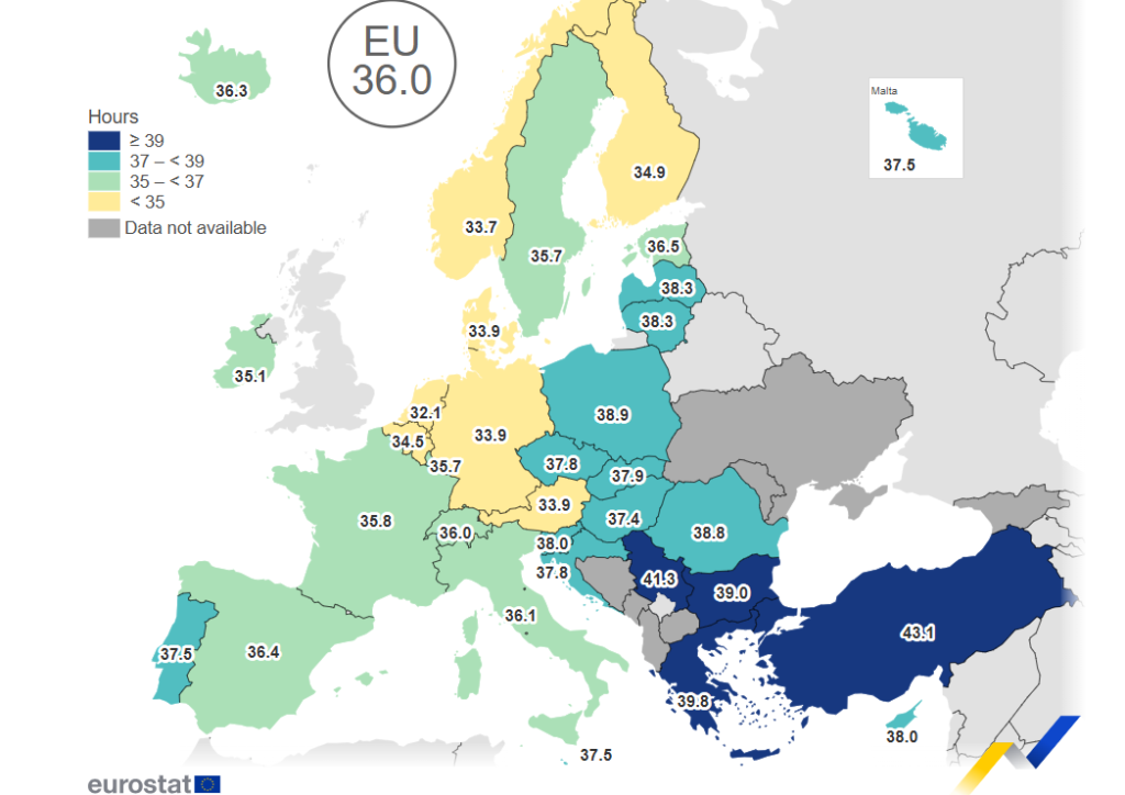Najduža radna sedmica je u Grčkoj (39,8 sati), a slijede Bugarska (39 sati), Poljska (38,9) i Rumunija (38,8). Za Hrvatsku, ta brojka iznosi 37,8. Ako se uključe i zemlje izvan EU za koje su dostupni podaci, Turska prednjači (43,1), a slijedi je Srbija (41,3).