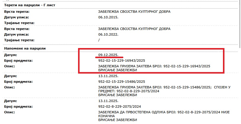 Naime, kako se može vidjeti u bazi RGZ-a, 9. decembra upisane su još dvije zabilježbe na prostoru ovog kompleksa. To je još jedna promjena u posljednjih nekoliko nedjelja. Podsjetimo, dvije zabilježbe upisane su i pred kraj novembra. Odnosile su se na zgradu Starog generalštaba u Ulici Kneza Miloša.