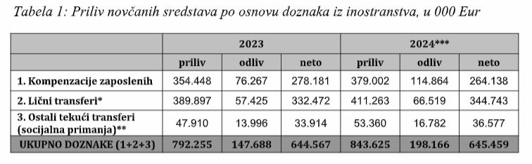 „Po osnovu kompenzacija zaposlenih, gdje je ostvareni priliv iznosio 379 miliona eura (44,93% ukupnog priliva). Pozitivna kretanja kod ove dvije kategorije najviše su uticala na rast ukupnog priliva doznaka. Rast priliva kompenzacija zaposlenih iznosio je 24,55 miliona eura ili 6,93%, dok je povećanje priliva ličnih transfera iznosilo 21,37 miliona eura ili 5,48%. Na ostale tekuće transfere odnosilo se 53,36 miliona eura ili 6,33% ukupnog priliva doznaka, i veći su za 11,37% u odnosu na 2023. godinu“, saopštili su iz CBCG.