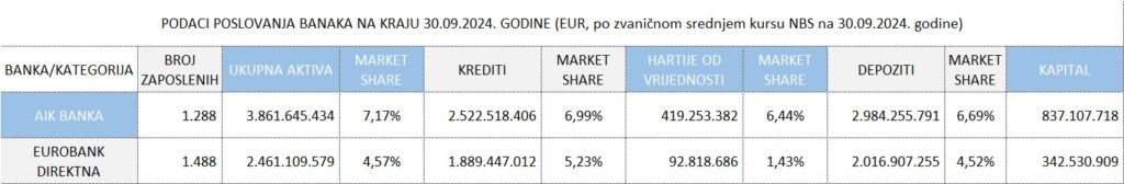 U Srbiji posluje 20 aktivnih banaka čija je ukupna aktiva na kraju septembra mjeseca iznosila skoro 54 milijarde eura, a AIK banka je sa aktivom od 3,8 milijardi eura zauzimala 7. mjesto, dok je Eurobank Direktna bila na poziciji broj 9 sa aktivom vrijednom 2,46 milijardi eura. Posmatrajući ih zajedno, ove dvije banke su na kraju devetog mjeseca zauzimale 11,7 odsto bankarskog tržišta u Srbiji.