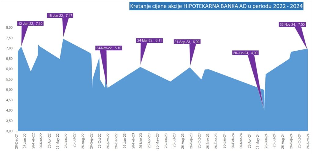 Bankar navodi da je dogovorena cijene (9,77 eur po akciji značajno iznad posljednje zabilježene cijene akcija Hipotekarne banke kojima je trgovano na Montenegroberzi 26. novembra na nivou od 7 eura. Akcijama ove banke u posljednjih 3 godine trgovalo se u rasponu od maksimalnih 7,47 eura 15. juna 2022. godine pa sve do mininalnih četiri eura eura koliko je iznosila cijena jedne akcije 20. juna ove godine.