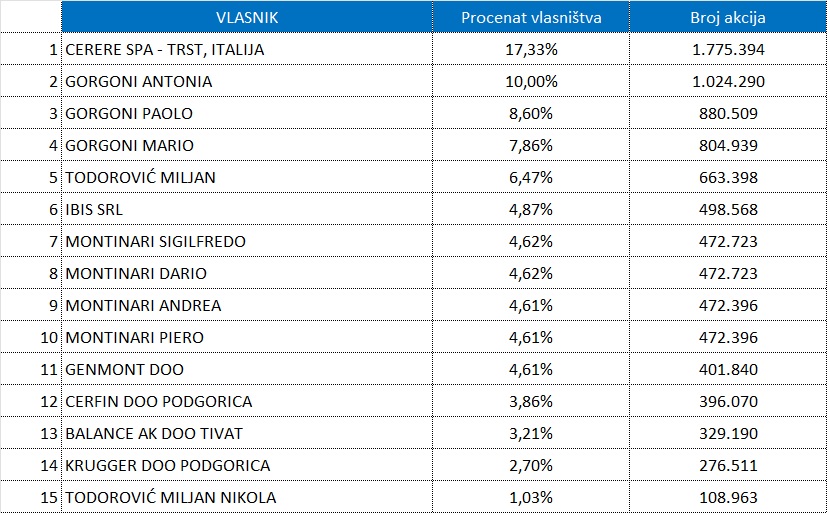 Ističe da je kompanija Ćerere u vlasništvu Miljana Todorovića, inače rođenog Cetinjanina, ali ujedno i uspješnog italijanskog biznismena. On je vlasnik kompanije Cerfin doo Podgorica, koja se takođe nalazi na ovom spisku najvećih akcionara, dok su na listi još i domaće kompanije: tivatske firme Genmont doo i Balance AK doo i podgorička firma Krugger doo, a sve tri u 100-odstotnom vlasništvu Amele Kadrić.