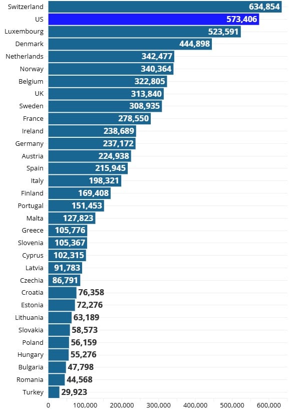 Prema Izvještaju o globalnom bogatstvu 2025. banke UBS, kao i dodatnim podacima dostavljenim Juronjuzu (Euronews), prosječno bogatstvo po odrasloj osobi u 2024. godini znatno je variralo među 31 evropskom zemljom. Kretalo se od 29.923 eura u Turskoj do 634.584 eura u Švajcarskoj. Unutar EU razlika je bila nešto manja, ali i dalje značajna: od 44.568 eura u Rumuniji do 523.591 eura u Luksemburgu.