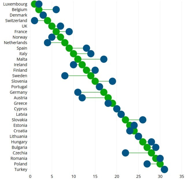 Finansijska središta poput Švajcarske i Luksemburga predvode ljestvicu. Nordijske zemlje takođe postižu dobre rezultate, iako ne ujednačeno – Finska se nalazi bliže sredini tabele.