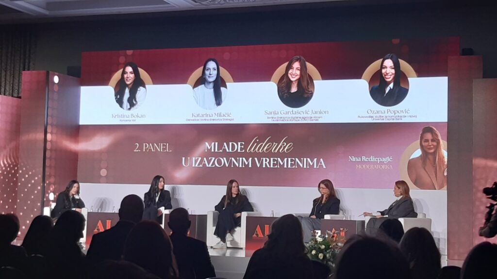 Na drugom panelu pod nazivom „Mlade liderke u izazovnim vremenima“, govorile su Kristina Bokan (kompanija Voli), Katarina Milačić, osnivačica i izvršna direktorka Strategist agencije, Sanja Gardašević Janion, izvršna direktorka digitalne agencije Alicorn i suosnivačica startapa ZUNO Games i Ozana Popović, rukovodilac službe za komunikacije i razvoj Universal Capital Bank.