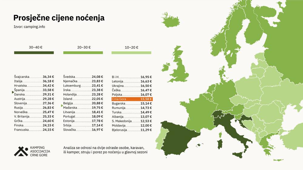 Iz Kamping asocijacije Crne Gore (KACG) saopštili su da prosječna cijena noćenja za dvije osobe iznosi 15,58 eura, uz uključenu parcelu, vozilo, struju i takse, što Crnu Goru svrstava u grupu pristupačnijih evropskih kamping destinacija.