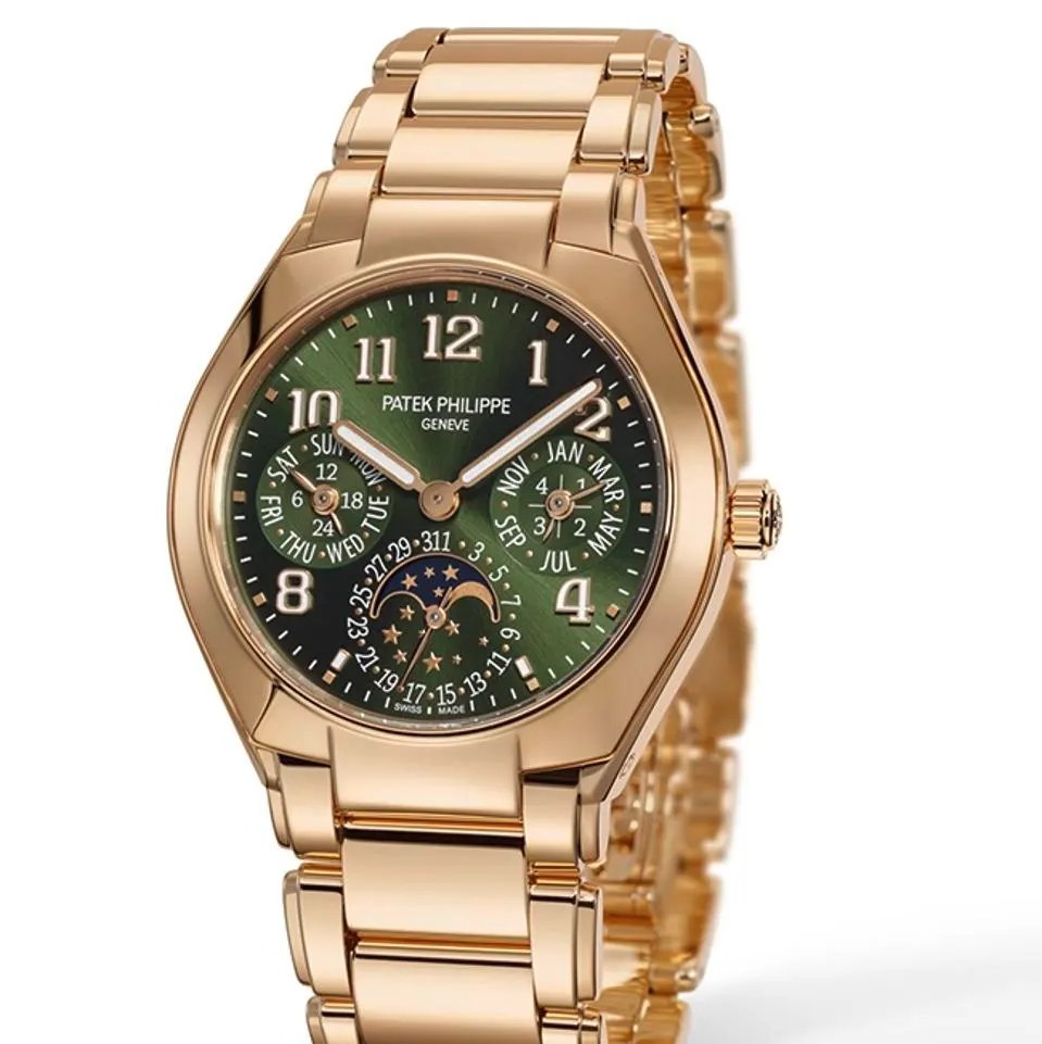 Kolekcija Twenty\~4 je od 1999. godine najpoznatija ženska linija brenda Patek Philippe i sve do redizajna 2018. godine, imala je isključivo kvarcne mehanizme. Tada je dobila automatski mehanizam, a ove godine prvi put i komplikaciju (dodatnu funkciju) vječnog kalendara. To je i očekivano, s obzirom na specijalizaciju brenda. Zeleni brojčanik je u skladu sa trendovima i savršeno se slaže sa kućištem i narukvicom od ružičastog zlata. Cijena: 126.080 dolara.