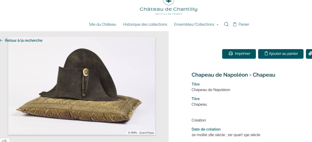 Carska zaostavština, vraćena sa Svete Helene, 1836. godine dodijeljena je Napoleonovoj sestri Karolin Mura (Caroline Murat). Šešir je 1904. godine ušao u zbirku muzeja Konde, ali je ubrzo pohranjen u depo i dugo je bio nepoznat stručnjacima i zaljubljenicima u Napoleonovo doba. Tek 2025. godine, tokom priprema za izložbu, Pariš je uspio da rekonstruiše put šešira i potvrdi njegovu autentičnost.