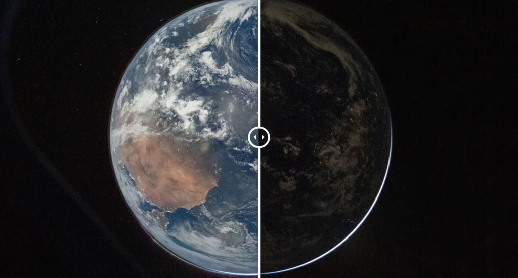 Na drugoj fotografiji, snimljenoj samo nekoliko minuta kasnije, sa kraćom ekspozicijom, više je naglašen noćni sjaj Zemlje, navodi NASA. Na planeti se vide rasuta svjetla električne rasvjete, dok se sunčeva svjetlost nazire duž ivice Zemlje.