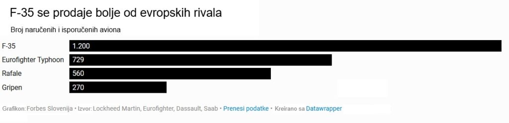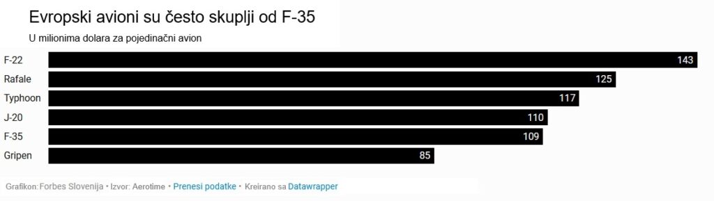 Jurofajter je takođe skuplji od F-35, s cijenom od oko 117 miliona dolara, prema podacima veb stranice Aerotime. To ne uključuje troškove svih usluga održavanja koje traju tokom cijelog životnog vijeka aviona. Proizvođač na svojoj veb stranici navodi da je do sada primio više od 729 porudžbina za avion.